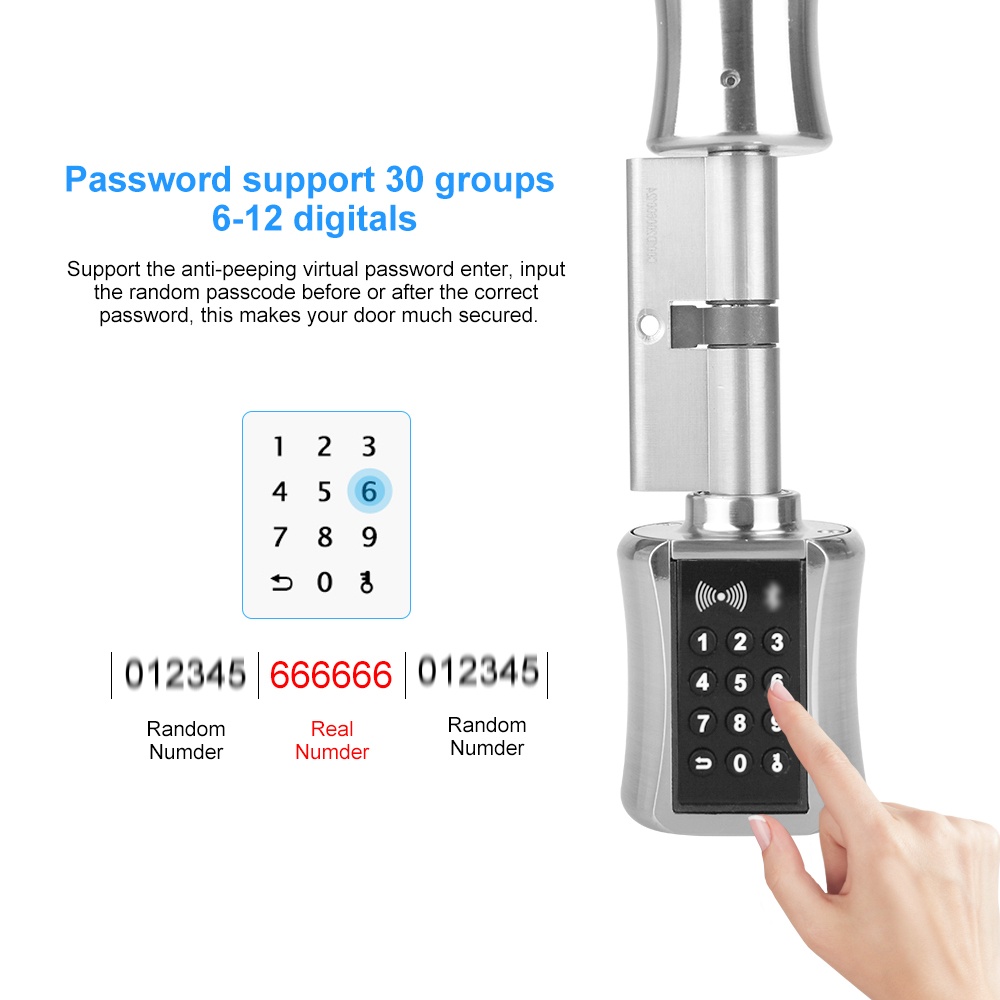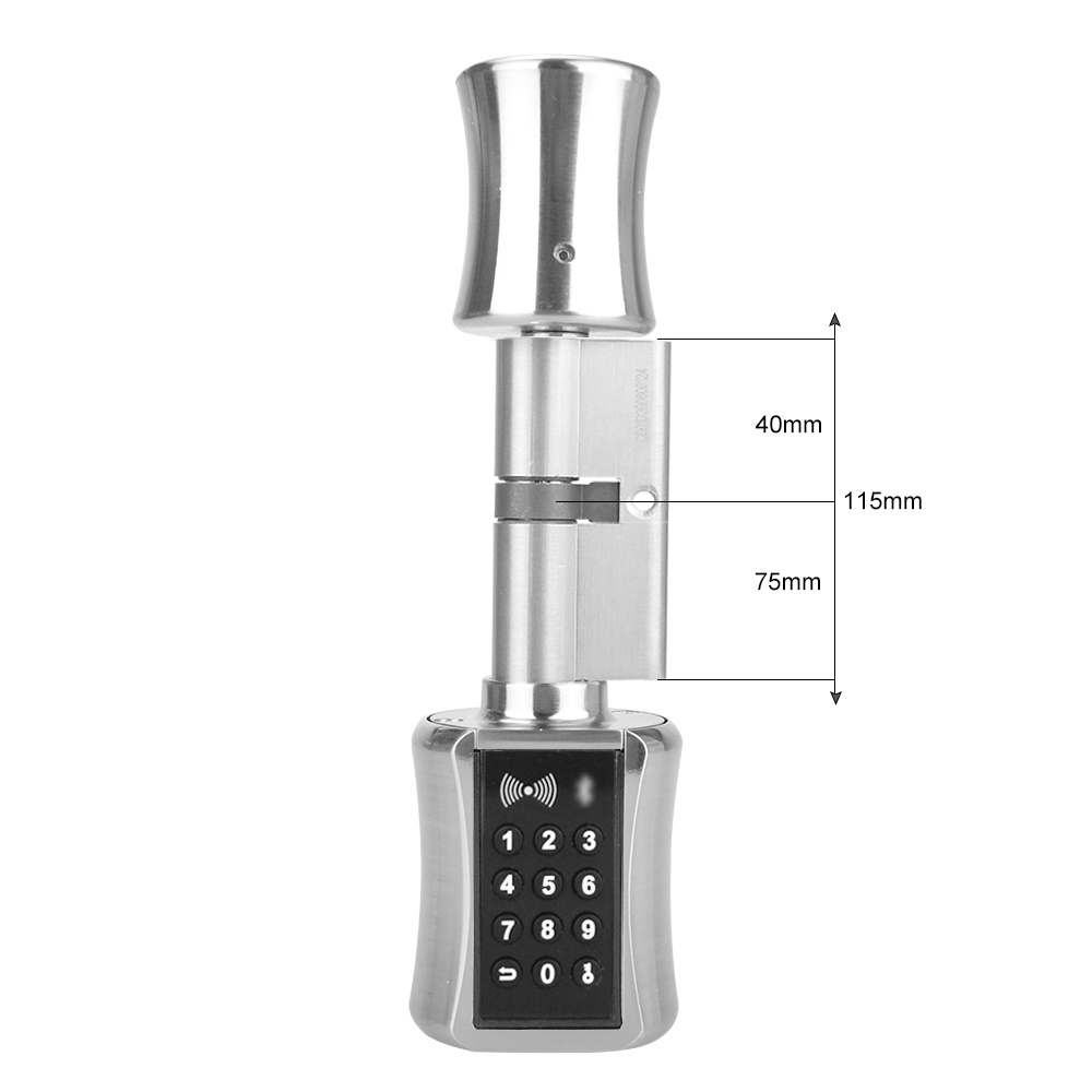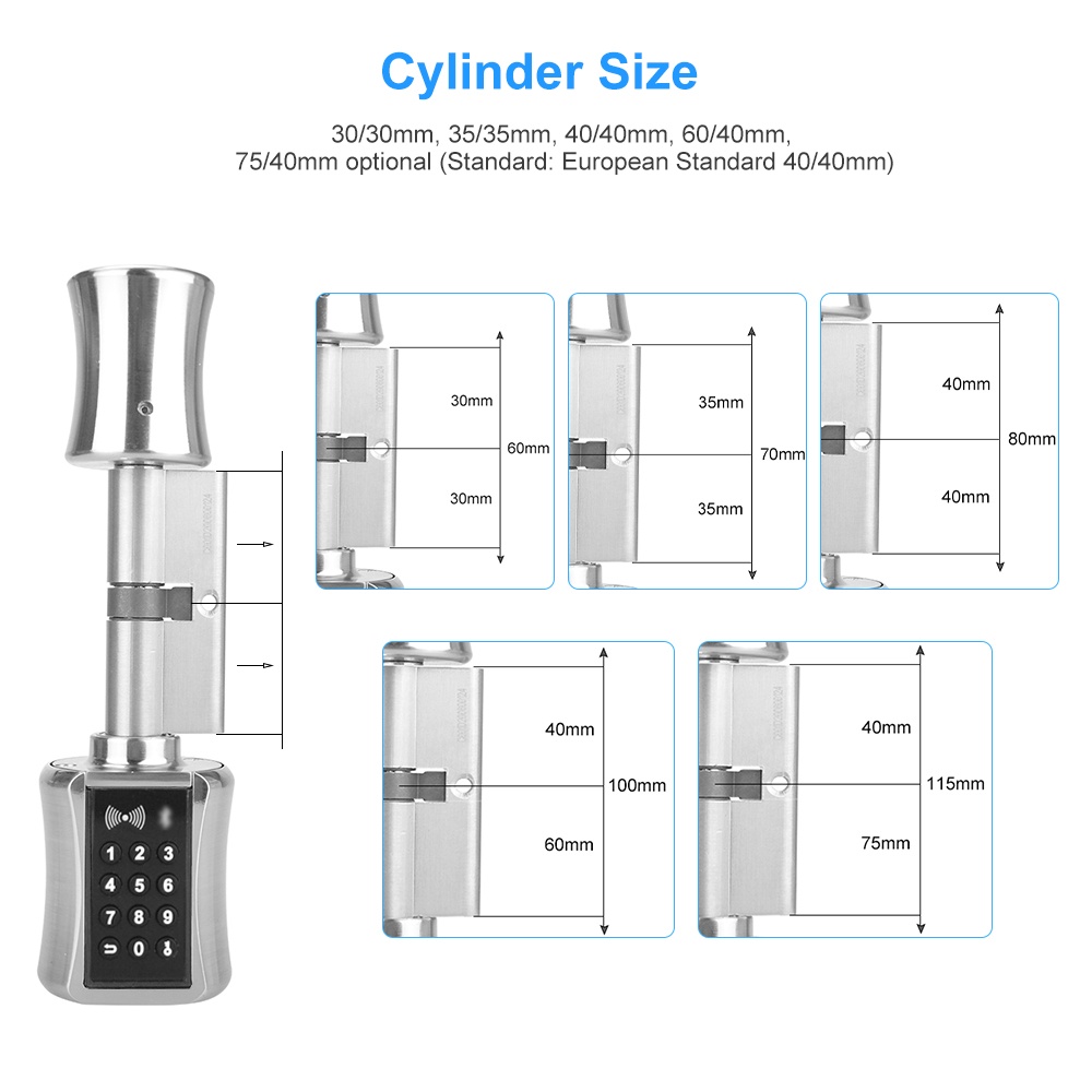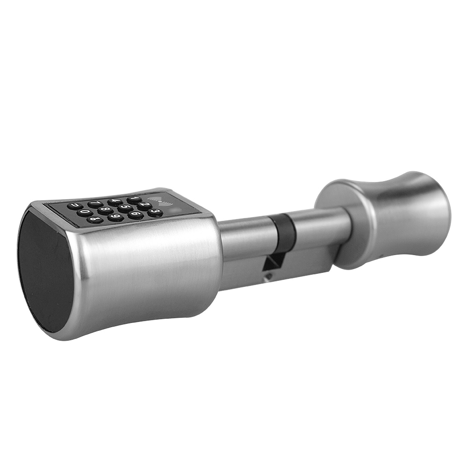 Smart cylinder with RFID-card, code, smartphone control via bluetooth. The cylinder is installed instead of the old euro-cylinder of any lock. Replacement and setting is done in 5 minutes using one screwdriver.