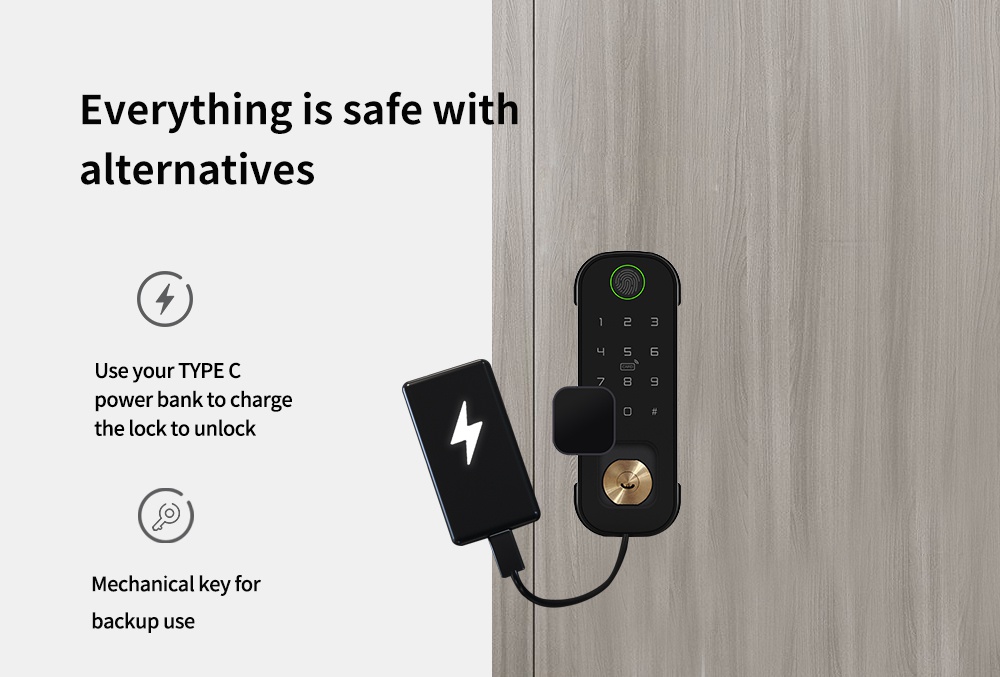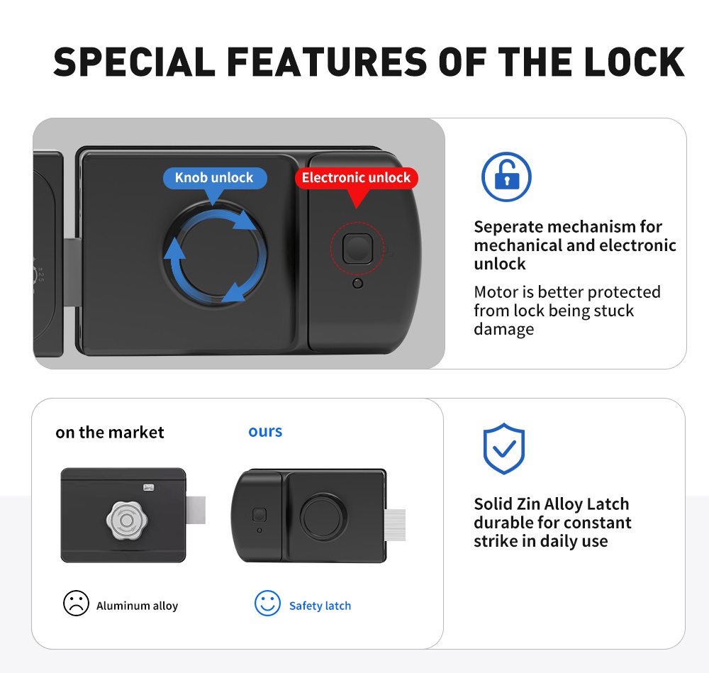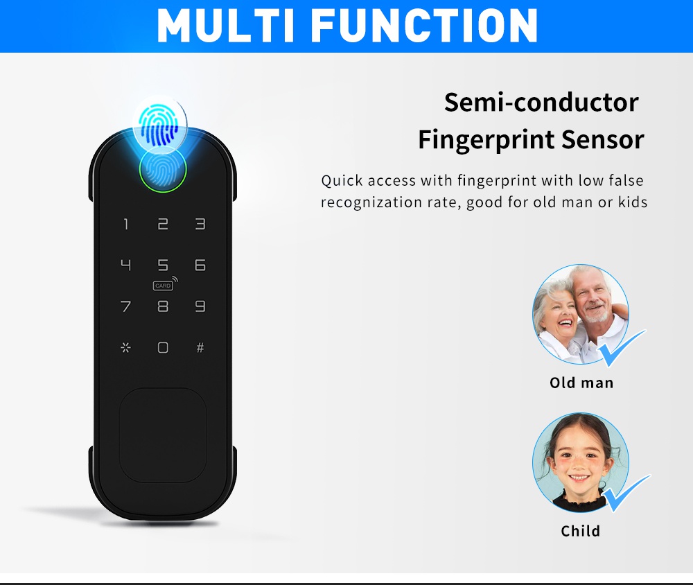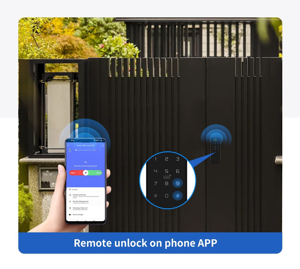 Smart biometric lock with code, card reader and radio remote control support. Designed for installation on gate, internal and external doors with the possibility of external power supply and intercom control.