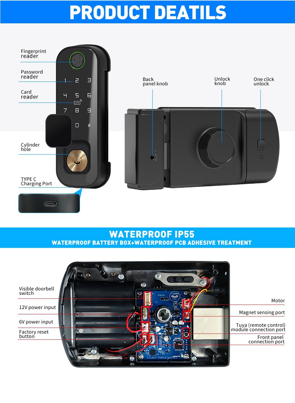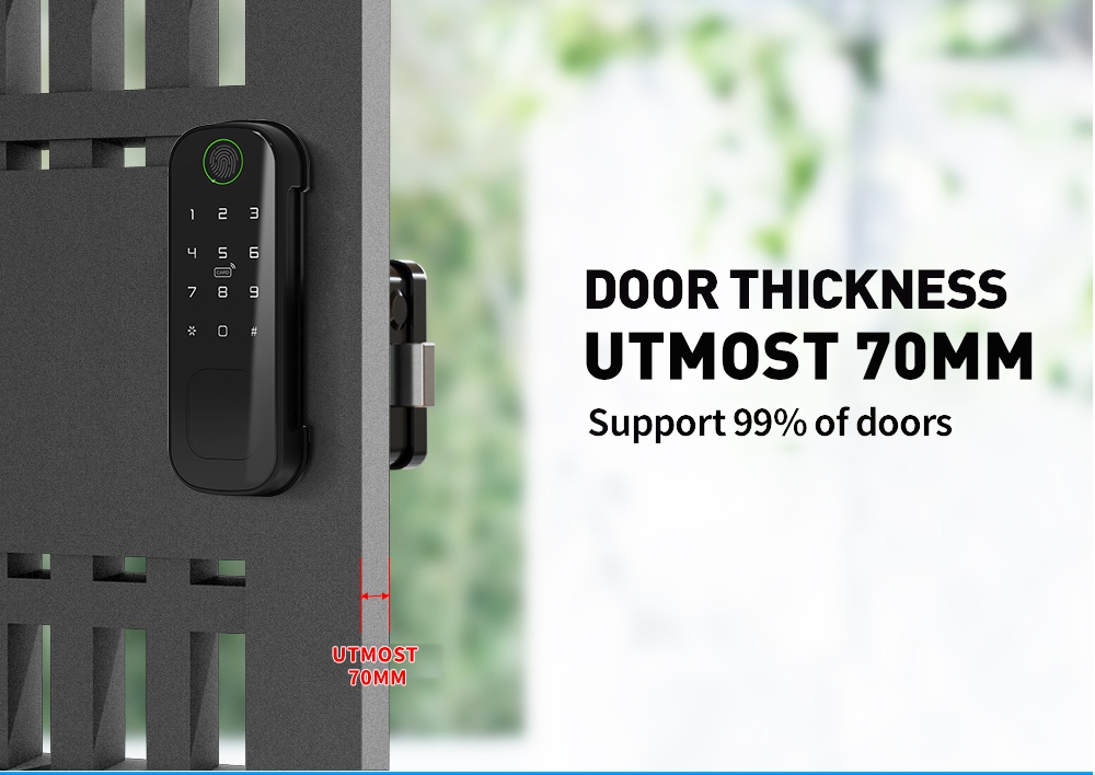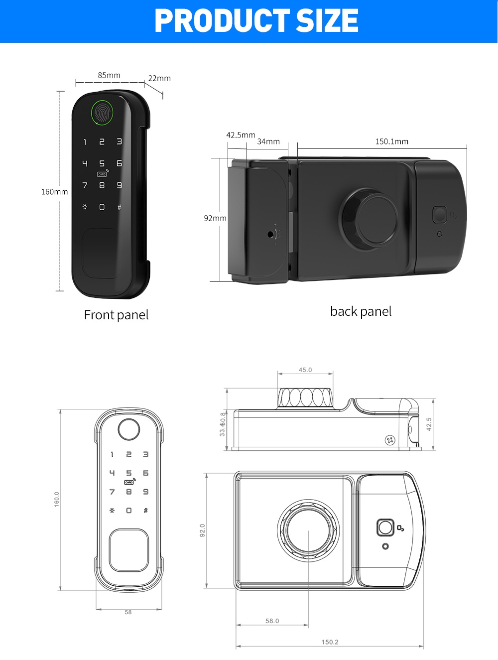 Smart biometric lock with code, card reader and radio remote control support. Designed for installation on gate, internal and external doors with the possibility of external power supply and intercom control.
