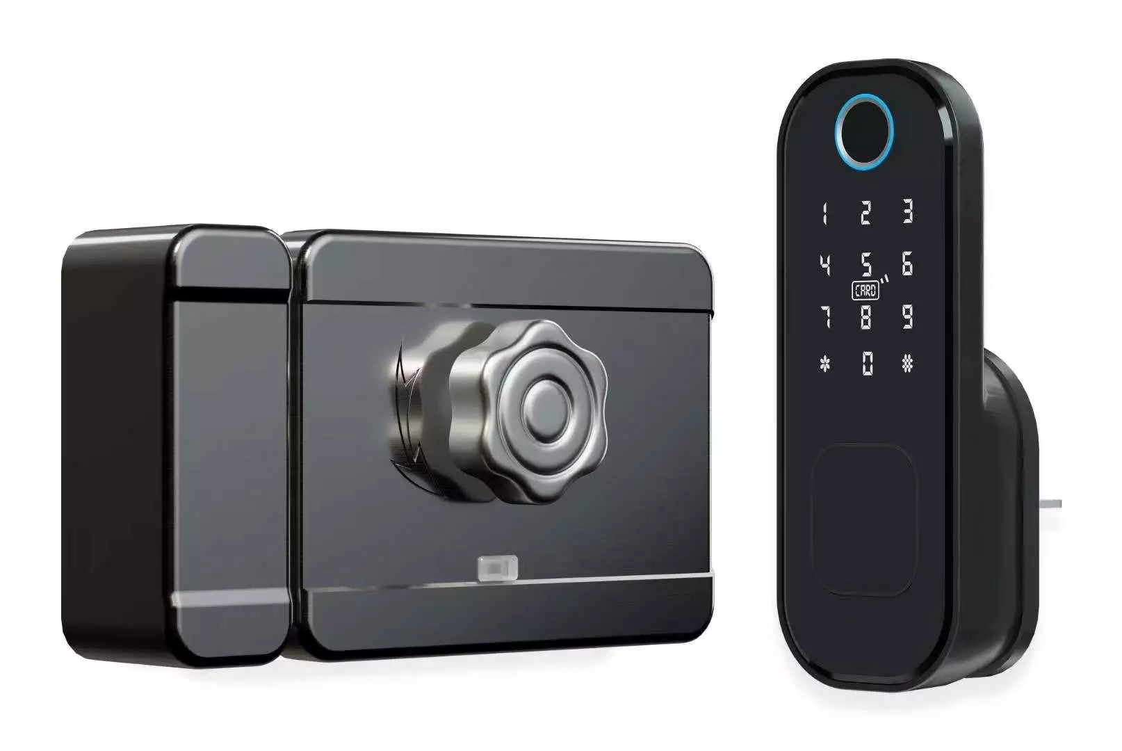 Smart biometric lock with code, card reader and radio remote control support. Designed for installation on gate, internal and external doors with the possibility of external power supply and intercom control.